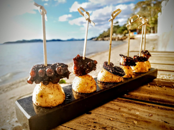 PATÊ DE OSTRA DEFUMADA NO CHIPS DE BATATA DOCE COM VINAGRETE